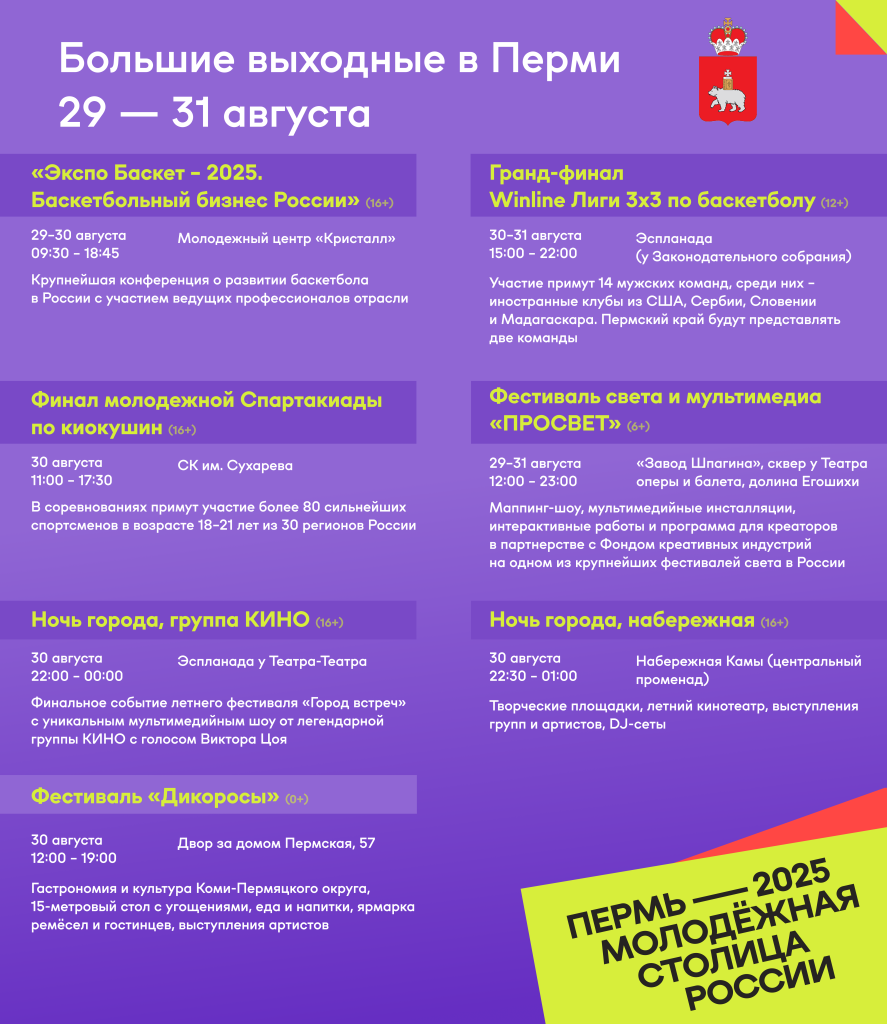 В последние выходные лета в Перми пройдут пять международных и федеральных событий